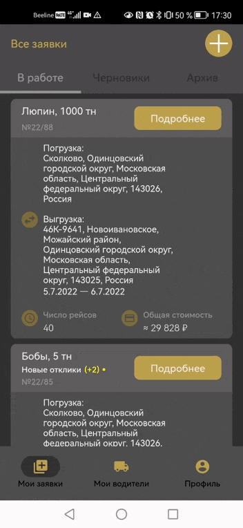 Когда вы публикуете заявку, она появляется на общей бирже водителей, и на нее может откликнуться любой желающий. Но если вы хотите работать с определенными людьми, которых знаете, вы можете приглашать знакомых водителей на перевозку груза. Для этого на пятом шаге создания заявки нажмите «Добавлено водителей: 0», и далее откроется список «Мои водители», и ниже — ваш список контактов на телефоне.